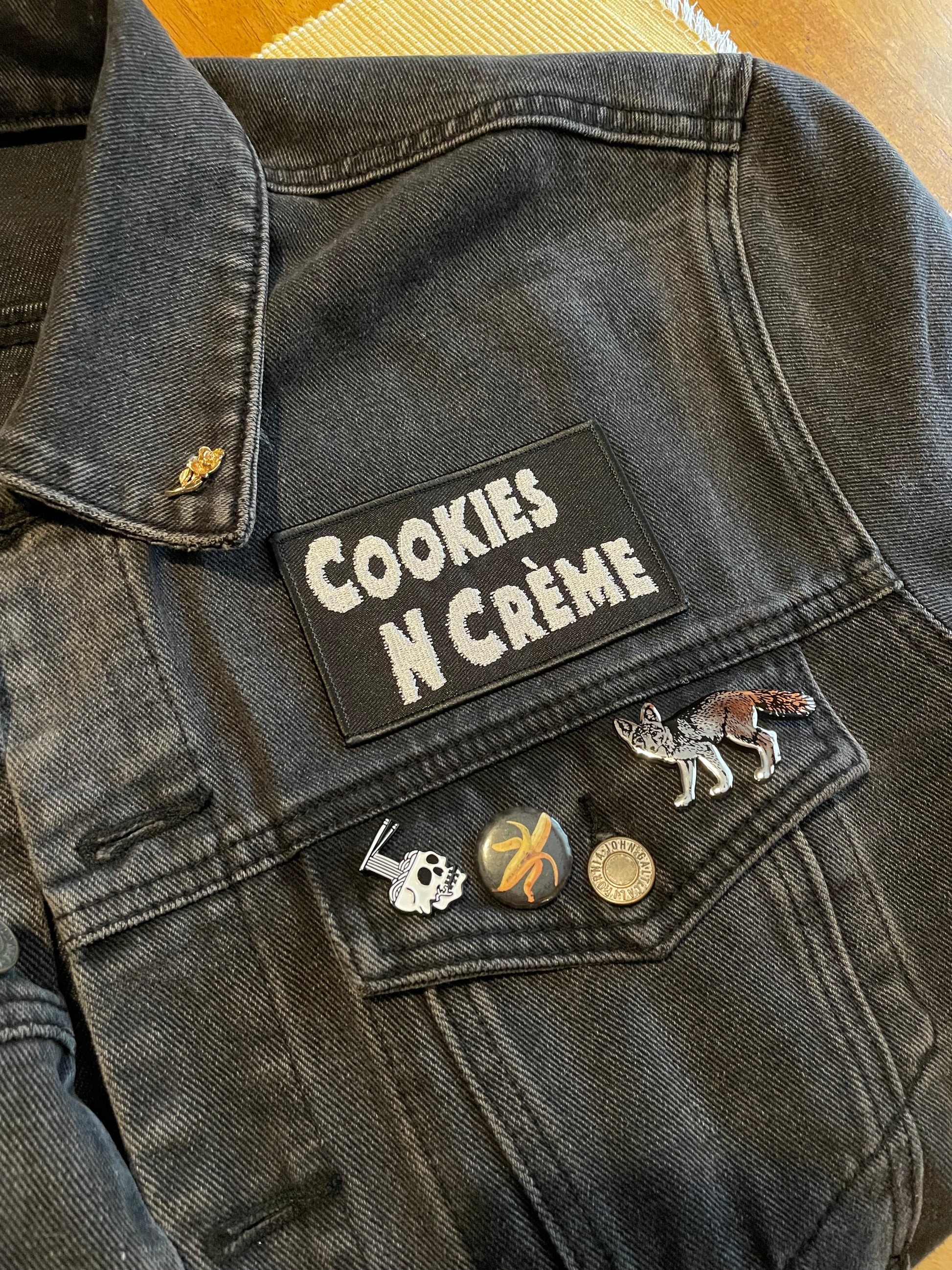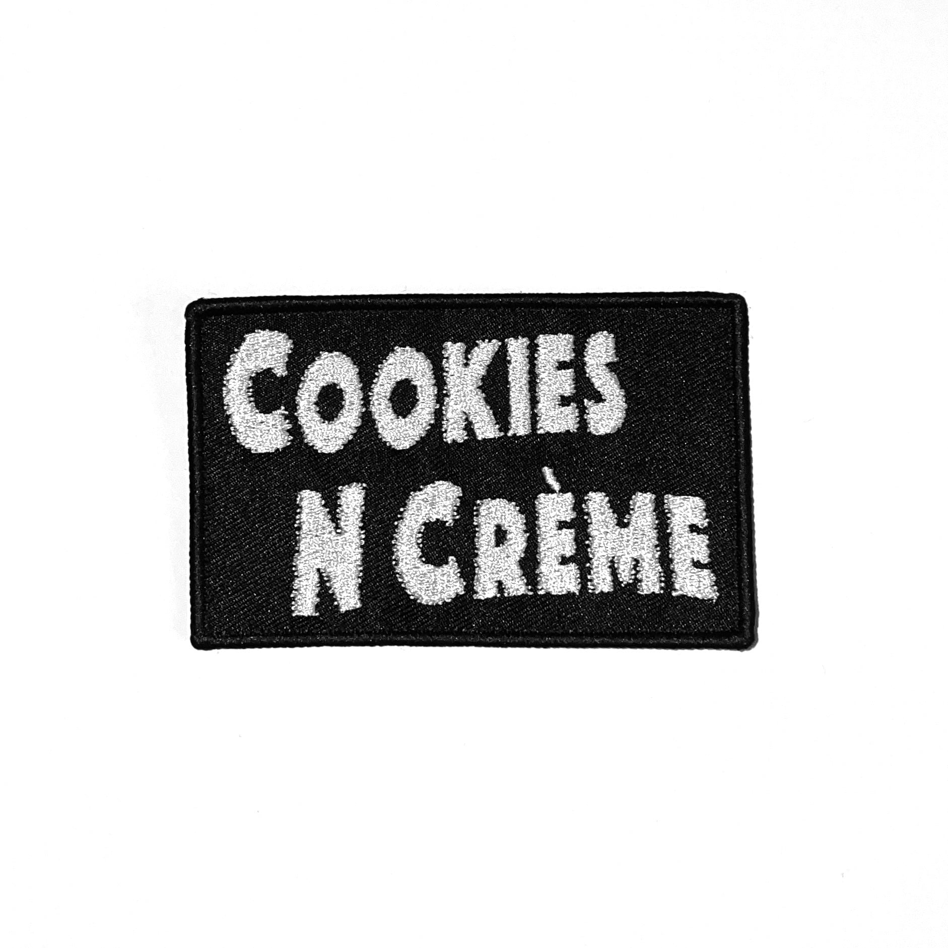 the first Cookies N Crème merch product! Featuring white embroidered band logo on black. Put it on a jacket, hat, tote bag, WHATEVA and be so super cool.