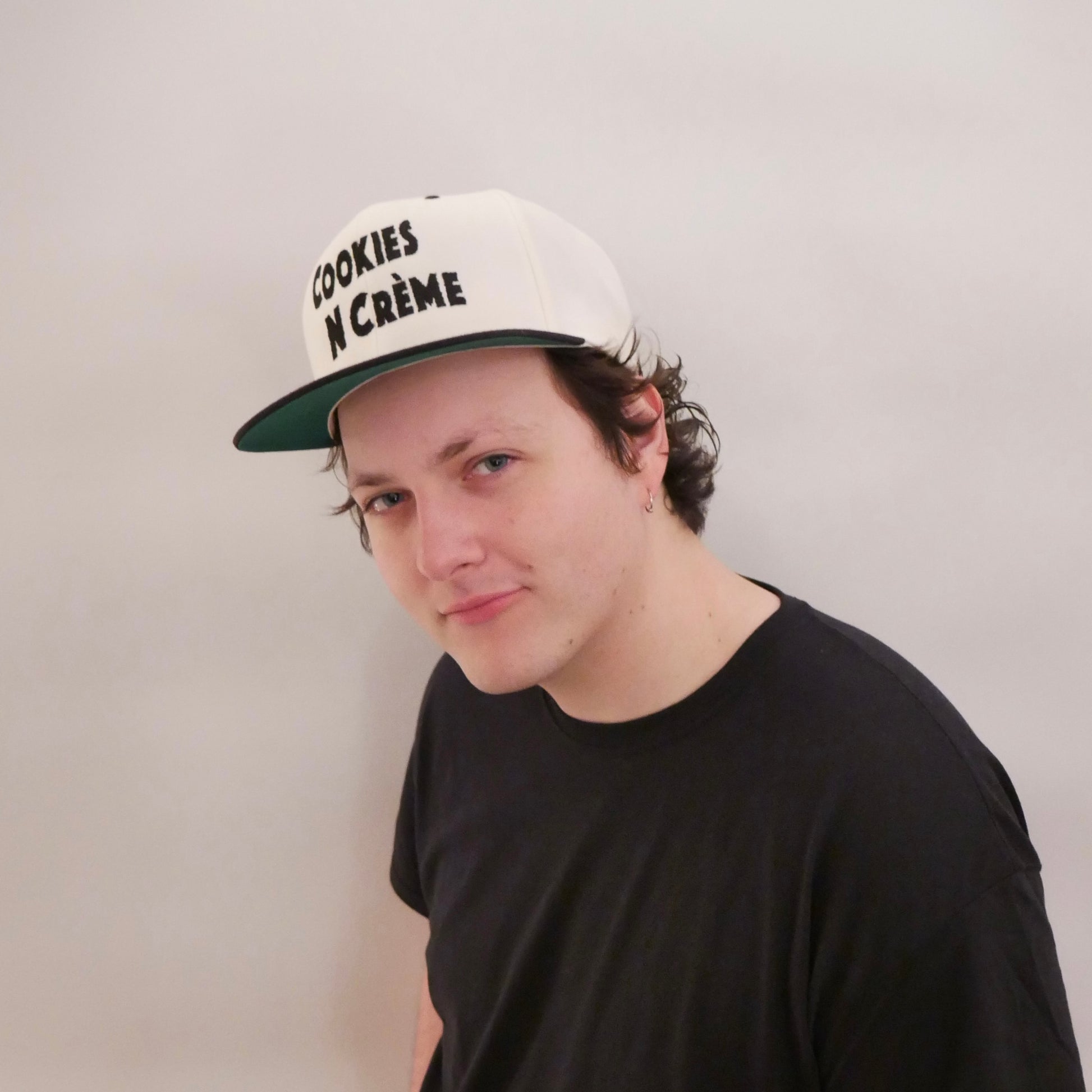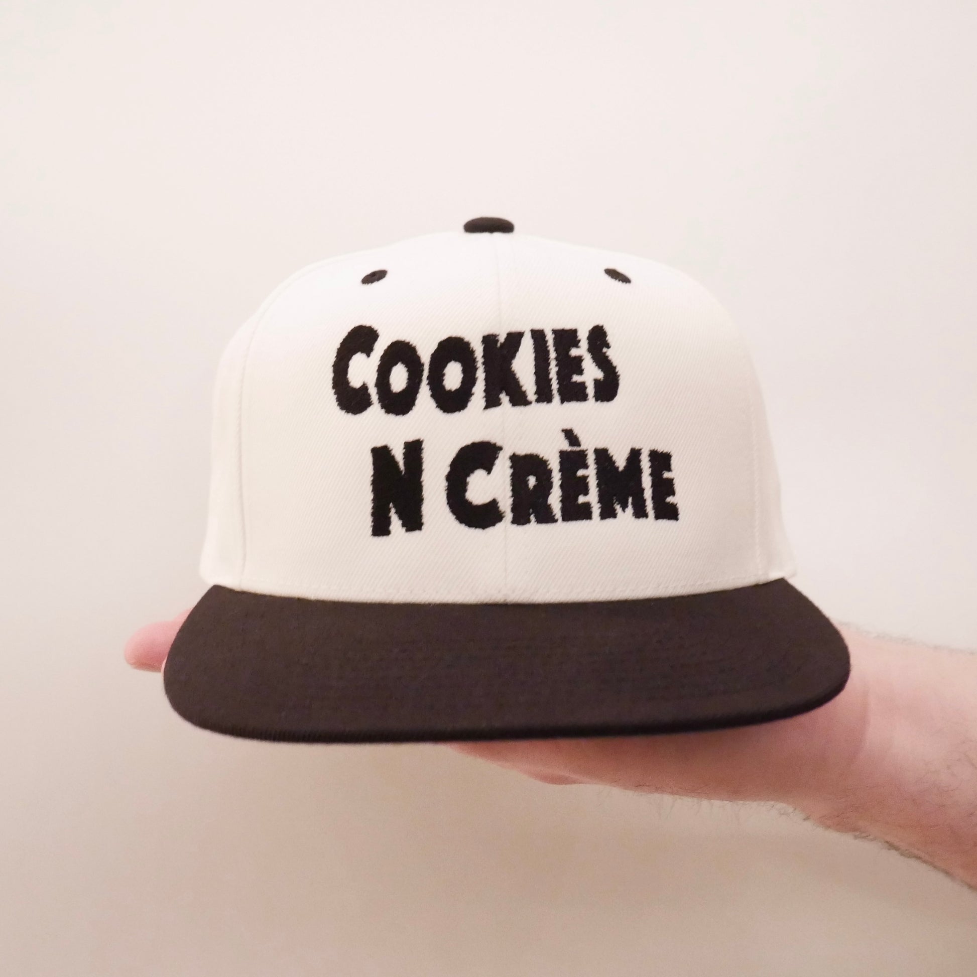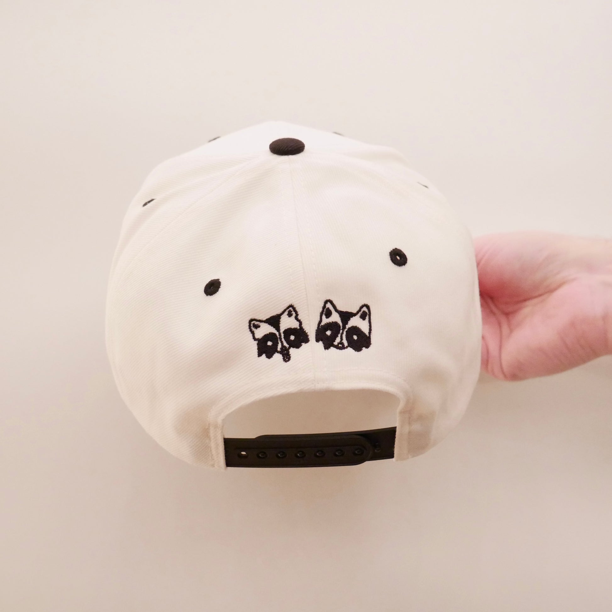 a very cool hat featuring the Cookies N Crème band logo on the front and a pair of mischievous raccoons on the back... woah!